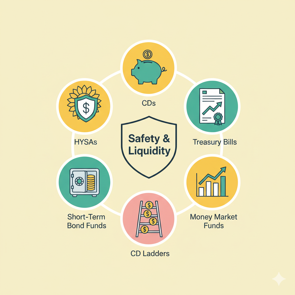 - Time Horizon: If you need money in <12 months, stick to HYSAs, MMFs, or T-Bills. For 1-3 years, consider CDs, short-term bonds, or a ladder.